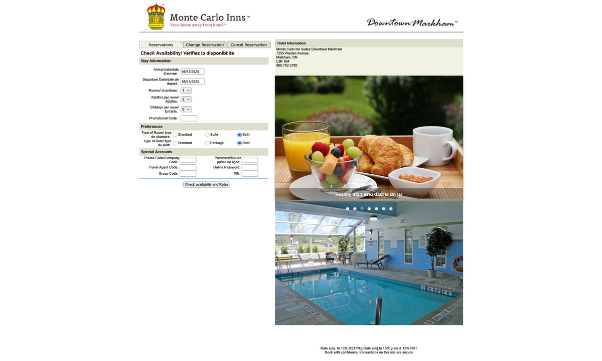 Note in addition to 13% HST taxes there is an additional 4% Markham Accommodation tax which will apply.